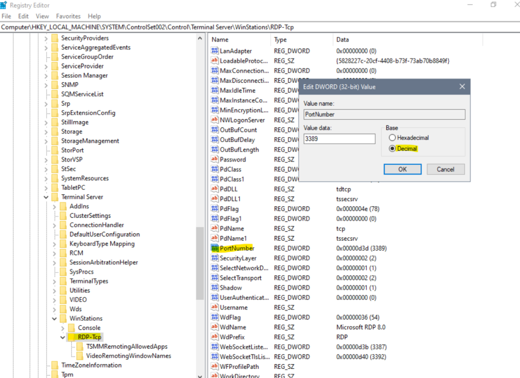 2. Change the value type (Base) to Decimal (if not already set). Now you can select a new port and confirm with OK. The default port is 3389.