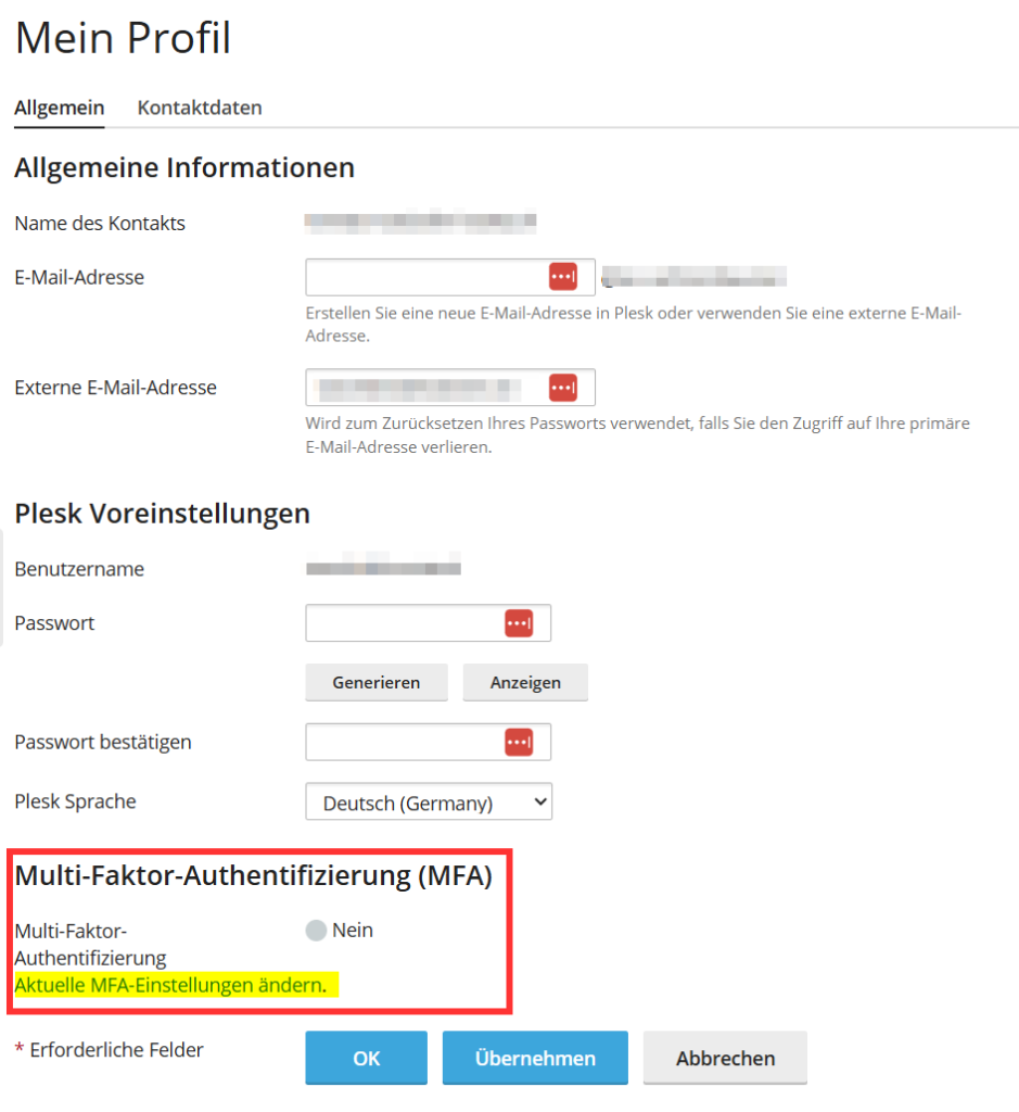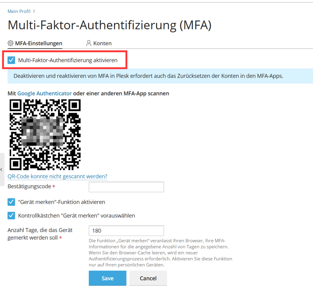- Activate “Activate multi-factor authentication”. The QR code now appears, which you scan with your Authenticator app. Follow the steps described.