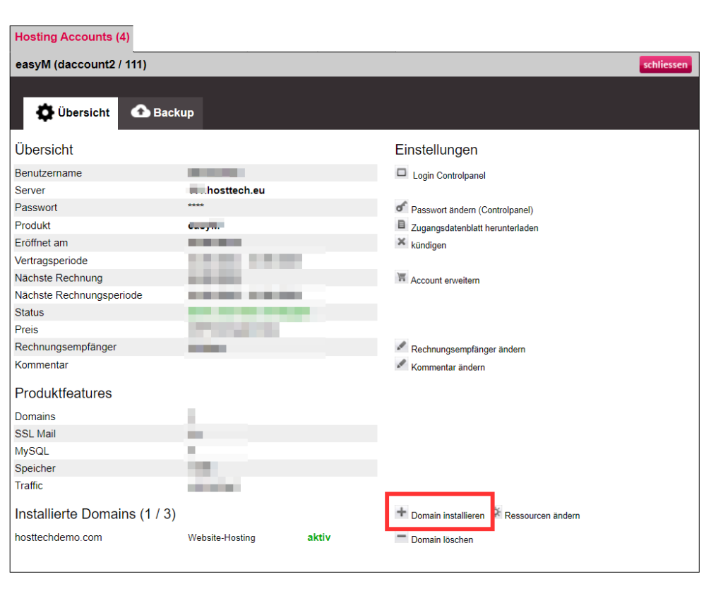 To do this, go to Servercenter > Servercenter in your myhosttech customer center and select your web hosting. Here you can then click on “Install domain” and install it as website hosting.